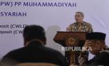 Direktur Utama KB Bank Syariah Koko T. Rachmadi (dari kiri) memberikan sambutan saat acara Penandatanganan Perjanjian Kerjasama mengenai Pengelolaan Dana Investasi Wakaf dalam bentuk Cash Waqf Linked Deposit (CWLD) di Jakarta, Selasa (9/7/2024). KB Bank Syariah (KBBS) melakukan kerja sama Pengelolaan Dana Investasi Wakaf dalam bentuk CWLD yang akan dilaksanakan oleh Majelis Pendayagunaan Wakaf dari tingkat pusat sampai dengan tingkat daerah yang berada dibawah naungan PP Muhammadiyah. (FOTO : Dok Republika)
