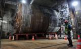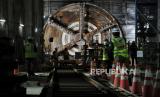Tamu undangan mengamati mesin bor terowongan di area pembangunan jalur MRT Jakarta fase 2A CP 203 di terowongan Stasiun Kota, Jakarta, Kamis (11/7/2024). PT MRT Jakarta (Perseroda) mencatat progres pembangunan paket CP 201 saat ini yakni meliputi Stasiun Bundaran HI-Monas mencapai 78,5 persen, CP 202 Stasiun Harmoni-Sawah Besar-Mangga Besar 32,2 persen dan CP 203 Stasiun Mangga Besr-Kota 57,89 persen. Stasiun MRT Kota tersebut dibangun di bawah tanah dengan kedalaman 24 meter dengan total panjang jalur dari Stasiun Mangga Besar hingga Stasiun Kota mencapai 1.400 meter. Untuk Stasiun Glodok terdiri dari dua lantai dengan panjang stasiun mencapai 240 meter sementara untuk Stasiun Kota terdiri dari 3 lantai dengan panjang stasiun 231,2 meter. Kedua stasiun tersebut ditargetkan rampung pada 2029 mendatang. (FOTO : Republika/Thoudy Badai)