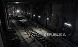 Suasana area pembangunan jalur MRT Jakarta fase 2A CP 203 di terowongan Stasiun Kota, Jakarta, Kamis (11/7/2024). PT MRT Jakarta (Perseroda) mencatat progres pembangunan paket CP 201 saat ini yakni meliputi Stasiun Bundaran HI-Monas mencapai 78,5 persen, CP 202 Stasiun Harmoni-Sawah Besar-Mangga Besar 32,2 persen dan CP 203 Stasiun Mangga Besr-Kota 57,89 persen. Stasiun MRT Kota tersebut dibangun di bawah tanah dengan kedalaman 24 meter dengan total panjang jalur dari Stasiun Mangga Besar hingga Stasiun Kota mencapai 1.400 meter. Untuk Stasiun Glodok terdiri dari dua lantai dengan panjang stasiun mencapai 240 meter sementara untuk Stasiun Kota terdiri dari 3 lantai dengan panjang stasiun 231,2 meter. Kedua stasiun tersebut ditargetkan rampung pada 2029 mendatang. (FOTO : Republika/Thoudy Badai)