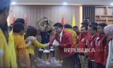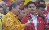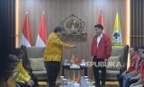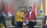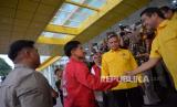 Ketua Umum Partai Golkar Airlangga Hartarto berjabat tangan dengan Ketua Umum PSI Kaesang Pangarep saat melakukan pertemuan silahturahmi di Kantor DPP Partai Golkar, Jakarta , Kamis (11/7/2024). Pertemuan silahturahmi antar kedua partai tersebut membahas komunikasi politik antara lain yaitu seputar Pilkada Serentak 2024. (FOTO : Republika/Prayogi)
