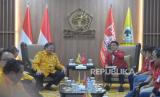 Ketua Umum Partai Golkar Airlangga Hartarto bersama Ketua Umum PSI Kaesang Pangarep saat melakukan pertemuan silahturahmi di Kantor DPP Partai Golkar, Jakarta , Kamis (11/7/2024). Pertemuan silahturahmi antar kedua partai tersebut membahas komunikasi politik antara lain yaitu seputar Pilkada Serentak 2024. (FOTO : Republika/Prayogi)