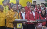 Ketua Umum Partai Golkar Airlangga Hartarto bersama Ketua Umum PSI Kaesang Pangarep memberikan keterangan usai melakukan pertemuan silahturahmi di Kantor DPP Partai Golkar, Jakarta , Kamis (11/7/2024). Pertemuan silahturahmi antar kedua partai tersebut membahas komunikasi politik antara lain yaitu seputar Pilkada Serentak 2024. (FOTO : Republika/Prayogi)