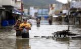 REPUBLIKA.CO.ID, GORONTALO -- Sejumlah warga melewati jalan yang tergenang banjir di Kota Gorontalo, Gorontalo, Kamis (11/7/2024).