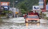 Kendaraan SAR yang membawa korban banjir untuk dievakuasi melewati jalan yang tergenang banjir di Kota Gorontalo, Gorontalo, Kamis (11/7/2024). BPBD Kota Gorontalo mendata sebanyak 1.669 KK atau mencapai 12.487 jiwa terdampak banjir yang menggenangi Kecamatan Kota Selatan, Hulonthalangi, Dumbo Raya, Kota Barat, Kota Timur, dan Dungingi akibat luapan sungai Bulango dan Bone. (FOTO : ANTARA FOTO/Adiwinata Solihin)