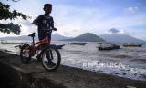Seorang anak mendorong sepedanya di dekat perahu nelayan yang lego jangkar saat tidak melaut di Pantai Fitu, Ternate, Maluku Utara, Sabtu (13/7/2024). Sebagian nelayan kecil di daerah itu memilih tidak melaut sejak sepekan terakhir setelah BMKG setempat mengeluarkan peringatan cuaca buruk dan gelombang tinggi mencapai 2,5 meter di perairan Maluku Utara. (FOTO : ANTARA FOTO/Andri Saputra)