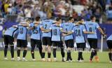 Para pamain Uruguay saling bergandeng tangan saat adu pinalti dalam pertandingan perebutan juara ke 3 Copa America 2024 di Charlotte, North Carolina, AS, Sabtu (13/7/2024). Uruguay berhasil mengalahkan Kanada dalam perebutan tempat ketiga Copa America 2024. Setelah bermain imbang 2-2 dalam waktu normal, Uruguay menang lewat adu penalti atas Kanada dengan skor 4-3. (FOTO : EPA-EFE/ERIK S. LESSER)
