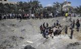 Warga Palestina memeriksa kerusakan di lokasi yang terkena pemboman di Khan Younis, Jalur Gaza selatan, Sabtu (13/7/2024). Menurut pejabat kesehatan setempat bahwa serangan udara Israel tersebut telah menewaskan setidaknya 90 warga Palestina di zona pengungsi camp kemanusiaan. Israel mengklaim serangan itu dilakukan untuk menargetkan panglima militer Hamas Mohammed Deif.  (FOTO : AP Photo/Jehad Alshrafi)