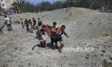 Warga Palestina mengevakuasi seorang korban tewas dari lokasi pemboman di Khan Younis, Jalur Gaza selatan, Sabtu (13/7/2024). Menurut pejabat kesehatan setempat bahwa serangan udara Israel tersebut telah menewaskan setidaknya 90 warga Palestina di zona pengungsi camp kemanusiaan. Israel mengklaim serangan itu dilakukan untuk menargetkan panglima militer Hamas Mohammed Deif.  (FOTO : AP Photo/Jehad Alshrafi)