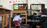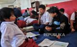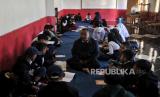 Pelajar mengikut kegiatan belajar pada hari pertama sekolah Tahun Ajaran Baru 2024/2025 di Madrasah Baitul Ghofur, Kampung Cilember, Desa Lebak Muncang, Kecamatan Ciwidey, Kabupaten Bandung, Jawa Barat, Senin (15/7/2024). Sebanyak 125 murid yang digabung mulai dari tingkat SD, SMP, SMA mengikuti kegiatan belajar di bangunan sekolah yang didirikan oleh keluarga Darwin pada tahun 2011. Terlihat sejumlah siswa belajar dengan beralaskan lantai karena keterbatasan fasilitas penunjang seperti meja dan kursi. (FOTO : Republika/Thoudy Badai)