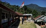 Darwin (59) mengibarkan bendera Merah Putih di Madrasah Baitul Ghofur, Kampung Cilember, Desa Lebak Muncang, Kecamatan Ciwidey, Kabupaten Bandung, Jawa Barat, Senin (15/7/2024). Sebanyak 125 murid yang digabung mulai dari tingkat SD, SMP, SMA mengikuti kegiatan belajar di bangunan sekolah yang didirikan oleh keluarga Darwin pada tahun 2011. Terlihat sejumlah siswa belajar dengan beralaskan lantai karena keterbatasan fasilitas penunjang seperti meja dan kursi. (FOTO : Republika/Thoudy Badai)