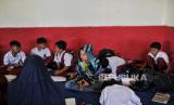 REPUBLIKA.CO.ID, CIWIDEY -- Pelajar mengikut kegiatan belajar pada hari pertama sekolah Tahun Ajaran Baru 2024/2025 di Madrasah Baitul Ghofur, Kampung Cilember, Desa Lebak Muncang, Kecamatan Ciwidey, Kabupaten Bandung, Jawa Barat, Senin (15/7/2024).