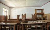 Tumpukan meja dan kursi yang rusak tersimpan di ruang kelas di Madrasah Baitul Ghofur, Kampung Cilember, Desa Lebak Muncang, Kecamatan Ciwidey, Kabupaten Bandung, Jawa Barat, Senin (15/7/2024). Sebanyak 125 murid yang digabung mulai dari tingkat SD, SMP, SMA mengikuti kegiatan belajar di bangunan sekolah yang didirikan oleh keluarga Darwin pada tahun 2011. Terlihat sejumlah siswa belajar dengan beralaskan lantai karena keterbatasan fasilitas penunjang seperti meja dan kursi. (FOTO : Republika/Thoudy Badai)