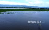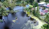 Foto udara lahan padi yang terendam banjir di Hunggaluwa, Kabupaten Gorontalo, Gorontalo, Selasa (16/7/2024). Data sementara Dinas Pertanian setempat mencatat 2.765 hektare lahan pertanian yang terdiri dari jagung, padi, cabai, ketimun, tomat dan terong terendam banjir akibat luapan Danau Limboto. (FOTO : ANTARA FOTO/Adiwinata Solihin)