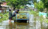 Warga membawa eceng gondok dan rumput gajah yang hanyut di Hunggaluwa, Kabupaten Gorontalo, Gorontalo, Selasa (16/7/2024). Data sementara Dinas Pertanian setempat mencatat 2.765 hektare lahan pertanian yang terdiri dari jagung, padi, cabai, ketimun, tomat dan terong terendam banjir akibat luapan Danau Limboto. (FOTO : ANTARA FOTO/Adiwinata Solihin)