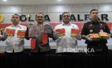 Direktur Reserse Narkoba Polda Kalbar Kombes Pol Thelly Iskandar Muda (kedua kanan) bersama Kabid Humas Polda Kalbar Kombes Pol Raden Petit (kedua kiri), Direktur Reskrimum Polda Kalbar Kombes Pol Bowo Gede Imantio (kiri) dan Kasi Narkoba dan Zat Adiktif lainnya Kejaksaan Tinggi Kalbar Willman Ernaldy (kanan) memperlihatkan barang bukti tindak pidana kejahatan narkotika saat konferensi pers di Pontianak, Kalimantan Barat, Rabu (17/7/2024). Direktorat Reserse Narkoba Polda Kalbar berhasil menggagalkan penyelundupan 19 kilogram sabu-sabu dari Kalbar tujuan Jakarta melalui jalur laut dengan menggunakan kapal, dan menangkap empat tersangka pelaku berinisial BR (warga binaan Lapas Kelas IIA Pontianak), LS, JS dan FAP. (FOTO : ANTARA FOTO/Jessica Wuysang)