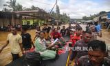 REPUBLIKA.CO.ID, HALMAHERA TENGAH -- Warga dan polisi mengevakuasi warga yang sakit saat banjir di Desa Lukulamo, Kabupaten Halmahera Tengah, Maluku Utara, Senin (22/7/2024).