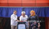 Direktur Utama bank bjb Yuddy Renaldi (tengah) bersama Direktur Utama PT Kereta Api Indonesia Didiek Hartantyo (kiri) dan Kepala Biro Perekonomian Sekretariat Daerah Provinsi Jawa Barat Yuke Mauliani Septina (kanan) menekan tombol saat peresmian naming rights stasiun LRT Pancoran bank bjb di Jakarta, Kamis (25/7/2024). Bank bjb kembali meningkatkan kolaborasi dengan PT Kereta Api Indonesia yang juga merupakan BUMN, sebagai operator LRT Jabodebek melalui program penamaan stasiun atau Naming Rights, untuk stasiun di kawasan Pancoran. Stasiun LRT Jabodebek di kawasan Pancoran kini akan menggunakan nama bank bjb yaitu menjadi Stasiun LRT Jabodebek Pancoran bank bjb, sebagai bagian dari langkah strategis untuk meningkatkan visibilitas merek serta mendorong penggunaan transportasi publik di Jakarta. (FOTO : Republika/Prayogi)
