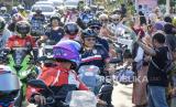 Sejumlah pembalap menyapa warga saat mengikuti parade keliling Mandalika jelang gelaran Idemitsu FIM Asia Road Racing Championship (ARRC) 2024 di KEK Mandalika, Desa Kuta, Kecamatan Pujut, Praya, Lombok Tengah, NTB, Kamis (25/7/2024). Ajang balapan round 4 Idemitsu FIM Asia Road Racing Championship (ARRC) 2024 akan berlangsung mulai tanggal 26-28 Juli 2024 yang diikuti 90 pembalap dari sejumlah negara di Asia yang 36 pembalap diantaranya merupakan pembalap Indonesia. (FOTO : ANTARA FOTO/Ahmad Subaidi)