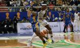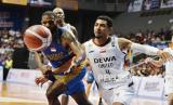 Pebasket Satria Muda Pertamina Jakarta Elgin Cook berusaha melewati adangan pebasket Dewa United Banten pada pertandingan pertama semi final playoff Indonesian Basketball League (IBL) 2024 di Britama Arena, Jakarta, Kamis (25/7/2024). Satria Muda Pertamina Jakarta menang dengan skor akhir 89-75. (FOTO : Republika/Edwin Dwi Putranto)