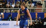 Pebasket Satria Muda Pertamina Jakarta Artem Pustovyi mengekspresikan kegembiraannya usai berhasil meraih tiga poin pada pertandingan pertama semi final playoff Indonesian Basketball League (IBL) 2024 melawan Dewa United Banten di Britama Arena, Jakarta, Kamis (25/7/2024). Satria Muda Pertamina Jakarta menang dengan skor akhir 89-75. (FOTO : Republika/Edwin Dwi Putranto)