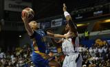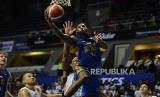 Pebasket Satria Muda Pertamina Jakarta Reynaldo Garcia Zamora berusaha melakukan lay up melewati adangan pebasket Dewa United Banten pada pertandingan pertama semi final playoff Indonesian Basketball League (IBL) 2024 di Britama Arena, Jakarta, Kamis (25/7/2024). Satria Muda Pertamina Jakarta menang dengan skor akhir 89-75. (FOTO : Republika/Edwin Dwi Putranto)