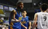 Pebasket Satria Muda Pertamina Jakarta Reynaldo Garcia Zamora melakukan protes kepada wasit seusai dilanggar pebasket Dewa United Banten pada pertandingan pertama semi final playoff Indonesian Basketball League (IBL) 2024 di Britama Arena, Jakarta, Kamis (25/7/2024). Satria Muda Pertamina Jakarta menang dengan skor akhir 89-75. (FOTO : Republika/Edwin Dwi Putranto)