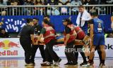 Pebasket Satria Muda Pertamina Jakarta Juan Laurent Kokodiputra ditandu keluar lapangan seusai mengalami cidera pada pertandingan pertama semi final playoff Indonesian Basketball League (IBL) 2024 melawan Dewa United Banten di Britama Arena, Jakarta, Kamis (25/7/2024). Satria Muda Pertamina Jakarta menang dengan skor akhir 89-75. (FOTO : Republika/Edwin Dwi Putranto)