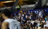 Suporter Satria Muda Pertamina Jakarta merayakan kemenangan timnya atas Dewa United Banten pada pertandingan pertama semi final playoff Indonesian Basketball League (IBL) 2024 di Britama Arena, Jakarta, Kamis (25/7/2024). Satria Muda Pertamina Jakarta menang dengan skor akhir 89-75. (FOTO : Republika/Edwin Dwi Putranto)