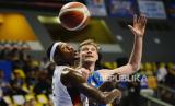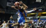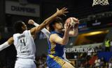 Pebasket Satria Muda Pertamina Jakarta Julian Alexandre Chalias berusaha melakukan lay up melewati adangan pebasket Dewa United Banten pada pertandingan pertama semi final playoff Indonesian Basketball League (IBL) 2024 di Britama Arena, Jakarta, Kamis (25/7/2024). Satria Muda Pertamina Jakarta menang dengan skor akhir 89-75. (FOTO : Republika/Edwin Dwi Putranto)