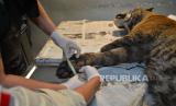 Dokter hewan memeriksa bangkai harimau sumatera (Panthera tigris Sumatrae) sebelum dilakukan nekropsi di UPTD Rumah Sakit Hewan Sumatera Barat, di Padang, Jumat (26/7/2024). BKSDA Sumbar mengevakuasi bangkai harimau betina yang kaki depan kirinya sudah buntung itu karena ditemukan mati terjerat di dekat kebun warga di Jorong Sungai Pua, Nagari Sungai Pua, Palembayan, Agam pada Kamis (25/7/2024). (FOTO : ANTARA FOTO/Iggoy el Fitra)