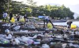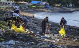 Sejumlah Komunitas Anak Muda Sadar Sampah (Ankam) memungut sampah di Pesisir Pantai Gambesi, Ternate, Maluku Utara, Ahad (28/7/2024). Aksi bersih-bersih pantai yang dilakukan tersebut sebagai bentuk kepedulian terhadap lingkungan sekaligus mengantisipasi sampah plastik yang ada di pantai terbawa arus ke laut. (FOTO : ANTARA FOTO/Andri Saputra)