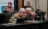 Direktur Utama bank bjb Yuddy Renaldi (kiri) berbincang dengan Direktur Keuangan Hana Dartiwan (kanan) saat sesi pemaparan capaian saat Earning Call di Jakarta, Selasa (30/7/2024). Pada Triwulan II 2024, bank bjb mencatat kinerja yang tetap terjaga dengan berbagai capaian diantaranya kinerja bank bjb dari sisi aset hingga akhir Juni 2024 bertumbuh sebesar 16,6 persen year on year (YoY) atau sebesar Rp207,3 triluin. Selain itu, bank bjb berhasil menjaga keseimbangan dalam hal Dana Pihak Ketiga (DPK) dengan penyaluran kredit pada Juni 2024 tercatat sebesar Rp150,2 triliun atau tumbuh 16,4 persen YoY. (FOTO : Republika/Thoudy Badai)