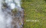 Foto udara petugas BPBD Muaro Jambi memadamkan lahan yang terbakar di Desa Pudak, Muaro Jambi, Jambi, Kamis (1/8/2024). Sekitar 10 hektare lahan di kawasan itu terbakar pada Kamis (1/8/2024) siang. (FOTO : ANTARA FOTO/Wahdi Septiawan)