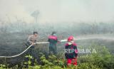 REPUBLIKA.CO.ID, JAMBI -- Petugas Manggala Agni Daops Kota Jambi bersama petugas kepolisian memadamkan lahan yang terbakar di Desa Pudak, Muaro Jambi, Jambi, Kamis (1/8/2024).