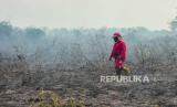 Petugas Manggala Agni Daops Kota Jambi berjalan di lokasi lahan yang terbakar di Desa Pudak, Muaro Jambi, Jambi, Kamis (1/8/2024). Sekitar 10 hektare lahan di kawasan itu terbakar pada Kamis (1/8/2024) siang, tim gabungan yang terdiri dari Manggala Agni Daops Kota Jambi, BPBD Muaro Jambi, TNI/Polri dan masyarakat kesulitan memadamkan api karena sulitnya sumber air. (FOTO : ANTARA FOTO/Wahdi Septiawan)