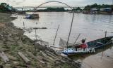 REPUBLIKA.CO.ID, PALANGKA RAYA -- Seorang nelayan menyandarkan perahunya di bantaran Sungai Kahayan yang mengalami penyusutan di Palangka Raya, Kalimantan Tengah, Jumat (2/8/2024).