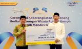 Direktur Bisnis Bank Mandiri Taspen Maswar Purnama (kiri) menghadiri seremonial pemberangkatan nasabah pemenang undian tabungan wisata rohani umroh di Bandara Internasional Soekarno Hatta, Tangerang, Banten, Kamis (1/8/2024). Program umroh ini adalah bentuk apresiasi terhadap kinerja Bank Mandiri Taspen yang meningkat. Bank Mandiri Taspen membukukan laba sebesar Rp 860,14 miliar sepanjang semester I-2024 dengan pertumbuhan kredit sebesar 12,98 persen (YoY) menjadi Rp 43,59 triliun. (FOTO : Dok Republika)
