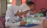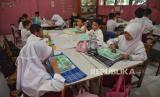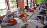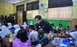 Para siswa bersiap menikmati makanan saat uji coba pelaksanaan program Makan Bergizi Gratis (MBG) di SDN 4 Kota Tangerang, Banten, Senin (5/8/2024). Uji coba MBG tersebut bertujuan mematangkan strategi dan mitigasi program unggulan Presiden dan Wakil Presiden Terpilih periode 2024-2029. Adapun paket menu yang disediakan hari ini adalah Nasi Putih, Fuyunghai, Capcay, Melon dan Susu. (FOTO : Republika/Prayogi)