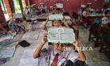 Para siswa menunjukan kotak makanan saat ujicoba pelaksanaan program Makan Bergizi Gratis (MBG) di SDN 4 Kota Tangerang, Banten, Senin (5/8/2024). Uji coba MBG tersebut bertujuan mematangkan strategi dan mitigasi program unggulan Presiden dan Wakil Presiden Terpilih periode 2024-2029. Adapun paket menu yang disediakan hari ini adalah Nasi Putih, Fuyunghai, Capcay, Melon dan Susu. (FOTO : Republika/Prayogi)