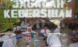 Para siswa menikmati makanan saat uji coba pelaksanaan program Makan Bergizi Gratis (MBG) di SDN 4 Kota Tangerang, Banten, Senin (5/8/2024). Uji coba MBG tersebut bertujuan mematangkan strategi dan mitigasi program unggulan Presiden dan Wakil Presiden Terpilih periode 2024-2029. Adapun paket menu yang disediakan hari ini adalah Nasi Putih, Fuyunghai, Capcay, Melon dan Susu. (FOTO : Republika/Prayogi)