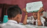 Para siswa memegang kotak makanan saat ujicoba pelaksanaan program Makan Bergizi Gratis (MBG) di SDN 4 Kota Tangerang, Banten, Senin (5/8/2024). Uji coba MBG tersebut bertujuan mematangkan strategi dan mitigasi program unggulan Presiden dan Wakil Presiden Terpilih periode 2024-2029. Adapun paket menu yang disediakan hari ini adalah Nasi Putih, Fuyunghai, Capcay, Melon dan Susu. (FOTO : Republika/Prayogi)
