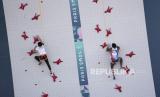 Atlet panjat tebing putra Indonesia Veddriq Leonardo (kiri) beradu cepat dengan atlet Indonesia lainnya Rahmat Adi Mulyono pada sesi eliminasi nomor speed putra Olimpiade Paris 2024 di Le Bourget Climbing Venue, Paris, Prancis, Selasa (6/8/2024). Veddriq Leonardo lolos ke perempat final dengan catatan terbaik 4,79 detik sedangkan Rahmat Adi Mulyono gagal lolos dengan catatan waktu terbaik 5,07 detik. (FOTO : AP Photo/Christophe Ena)