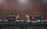 Ketua Mahkamah Konstitusi (MK) Suhartoyo (kiri) berbicara dengan hakim konstitusi Arsul Sani saat sidang pendahuluan pengujian materiil Undang-Undang tentang Pemilihan Umum di Ruang Sidang MK, Jakarta, Kamis (7/8/2024). Direktur Eksekutif Yayasan Jaringan Demokrasi dan Pemilu Berintegritas (NETGRIT) Hadar Nafis Gumay dan pegiat kepemiluan Titi Anggraini menggugat Pasal 222 Undang-Undang Nomor 7 Tahun 2017 tentang Pemilu perihal ambang batas pencalonan presiden ke Mahkamah Konstitusi. Mereka menguji konstitusionalitas pasal tersebut karena dianggap tidak memberikan keadilan bagi partai politik peserta pemilu yang tidak memiliki kursi di parlemen. (FOTO : Republika/Prayogi)