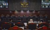 Suasana Ketua Mahkamah Konstitusi (MK) Suhartoyo (tengah) memimpin jalannya sidang pendahuluan pengujian materiil Undang-Undang tentang Pemilihan Umum di Ruang Sidang MK, Jakarta, Kamis (7/8/2024). Direktur Eksekutif Yayasan Jaringan Demokrasi dan Pemilu Berintegritas (NETGRIT) Hadar Nafis Gumay dan pegiat kepemiluan Titi Anggraini menggugat Pasal 222 Undang-Undang Nomor 7 Tahun 2017 tentang Pemilu perihal ambang batas pencalonan presiden ke Mahkamah Konstitusi. Mereka menguji konstitusionalitas pasal tersebut karena dianggap tidak memberikan keadilan bagi partai politik peserta pemilu yang tidak memiliki kursi di parlemen. (FOTO : Republika/Prayogi)