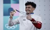 REPUBLIKA.CO.ID, PARIS -- Atlet panjat tebing putra Indonesia Veddriq Leonardo mencium medali seusai mengalahkan atlet China Wu Peng pada final nomor speed putra Olimpiade Paris 2024 di Le Bourget Climbing Venue, Paris, Prancis, Kamis (8/8/2024).