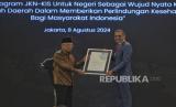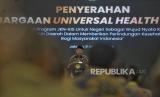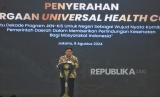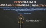 Direktur Utama BPJS Kesehatan Ghufron Mukti memberikan sambutan pada acara penyerahan Universal Health Coverage (UHC) Awards 2024 di Jakarta, Kamis (8/8/2024). Penghargaan ini menandai pencapaian Indonesia dalam menyediakan jaminan kesehatan yang menyeluruh bagi warganya melalui Program JKN, yang telah berlangsung selama satu dekade. Di samping itu, Indonesia telah mencapai UHC lebih dari 98 persen, melampaui target yang tertuang dalam Peraturan Presiden Nomor 36 Tahun 2023 tentang Peta Jalan Jaminan Sosial 2023-2024, di mana target kepesertaan JKN pada tahun 2024 sebanyak 98 persen. Penghargaan ini diserahkan kepada pemimpin daerah di 33 provinsi, serta 460 kabupaten/kota. (FOTO : Republika/Prayogi)