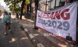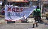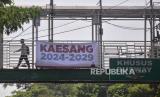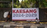 Pejalan kaki melintas didekat spanduk Kaesang 2024-2029 di Kawasan Mampang, Jakarta, Jumat (9/8/2024). Spanduk bertuliskan Kaesang 2024-2029 bermunculan di beberapa beberapa titik sudut Jakarta. Spanduk ini pun dikaitkan sebagai bentuk dukungan kepada Kaesang untuk maju dalam kontestasi pilgub Jakarta 2024. Nama Kaesang pun disebut-sebut berpotensi menjadi pasangan Ridwan Kamil di Pilgub Jakarta mendatang. (FOTO : Republika/Prayogi)