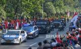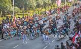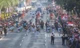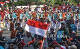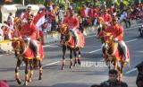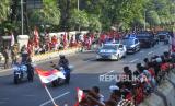 Suasana Kirab Bendera Sang Merah Putih dan Teks Proklamasi saat melintas di kawasan Patung Kuda, Jakarta, Sabtu (10/8/2024). Kirab yang membawa duplikat bendera pusaka dan teks proklamasi tersebut berangkat mulai dari Cawan Monas menuju Bandara Halim Perdanakusuma, lalu diterbangkan ke IKN. Acara yang digelar sebagai rangkaian persiapan Peringatan HUT RI ke-79 ini diharapkan dapat menjadi pengingat bagi generasi muda atas perjuangan para pahlawan bangsa menghadirkan kedaulatan Indonesia sebagai negara. (FOTO : Republika/Prayogi)