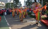 Penari menghibur warga yang menyaksikan Kirab Bendera Sang Merah Putih dan Teks Proklamasi saat melintas di kawasan Bundaran HI, Jakarta, Sabtu (10/8/2024). Kirab yang membawa duplikat bendera pusaka dan teks proklamasi tersebut berangkat mulai dari Cawan Monas menuju Bandara Halim Perdanakusuma, lalu diterbangkan ke IKN. Acara yang digelar sebagai rangkaian persiapan Peringatan HUT RI ke-79 ini diharapkan dapat menjadi pengingat bagi generasi muda atas perjuangan para pahlawan bangsa menghadirkan kedaulatan Indonesia sebagai negara. (FOTO : Republika/Prayogi)