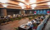 Presiden Joko Widodo (kedua kanan) didampingi Wakil Presiden Maruf Amin memimpin (kanan) sidang kabinet paripurna di Istana Garuda, Ibu Kota Nusantara (IKN), Penajam Paser Utara, Kalimantan Timur, Senin (12/8/2024). Sidang kabinet yang pertama kali diadakan di IKN tersebut membahas evaluasi pemerintahan pada tahun ini serta perencanaan tahun depan termasuk transisi pemerintahan Presiden terpilih Prabowo Subianto dan Wakil Presiden terpilih Gibran Rakabuming Raka. (FOTO : ANTARA FOTO/Sigid Kurniawan)